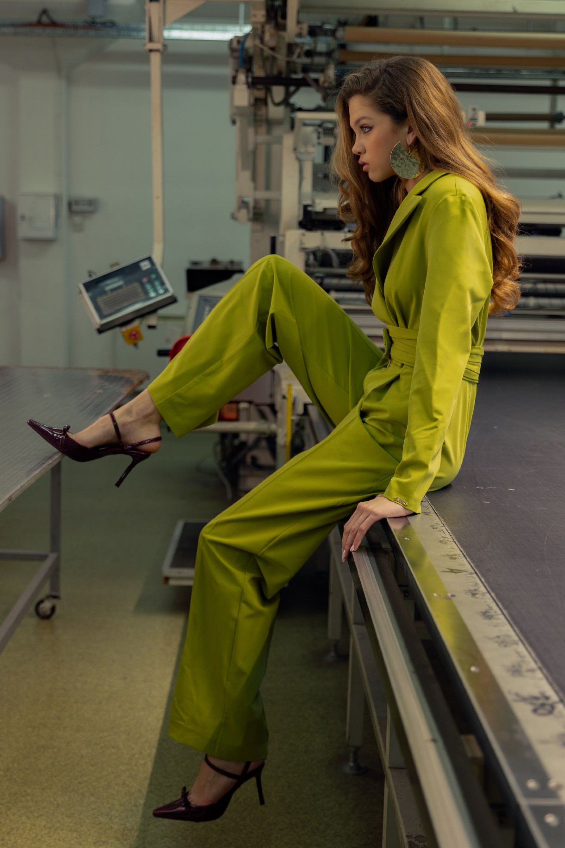 Ovaj zeleni kombinezon dugih rukava je prava definicija stila i sofisticiranosti. Svaki detalj izrađen je sa posebnom pažnjom i posvećenošću. Krasi ga klasična kragna s reverima, uz bočne džepove koji dodaju praktičnost i ležernost. Šire nogavice unose fluidnost u dizajn, čineći kombinezon ne samo vizualno privlačnim, već i udobnim za nošenje. Ono što izdvaja ovaj model je široki slojeviti pojas u istoj boji koji se elegantno kopča zlatnim dugmetom. Ovaj dodatak naglašava struk i donosi sofisticiranu notu, stvarajući siluetu koja laska figuri.