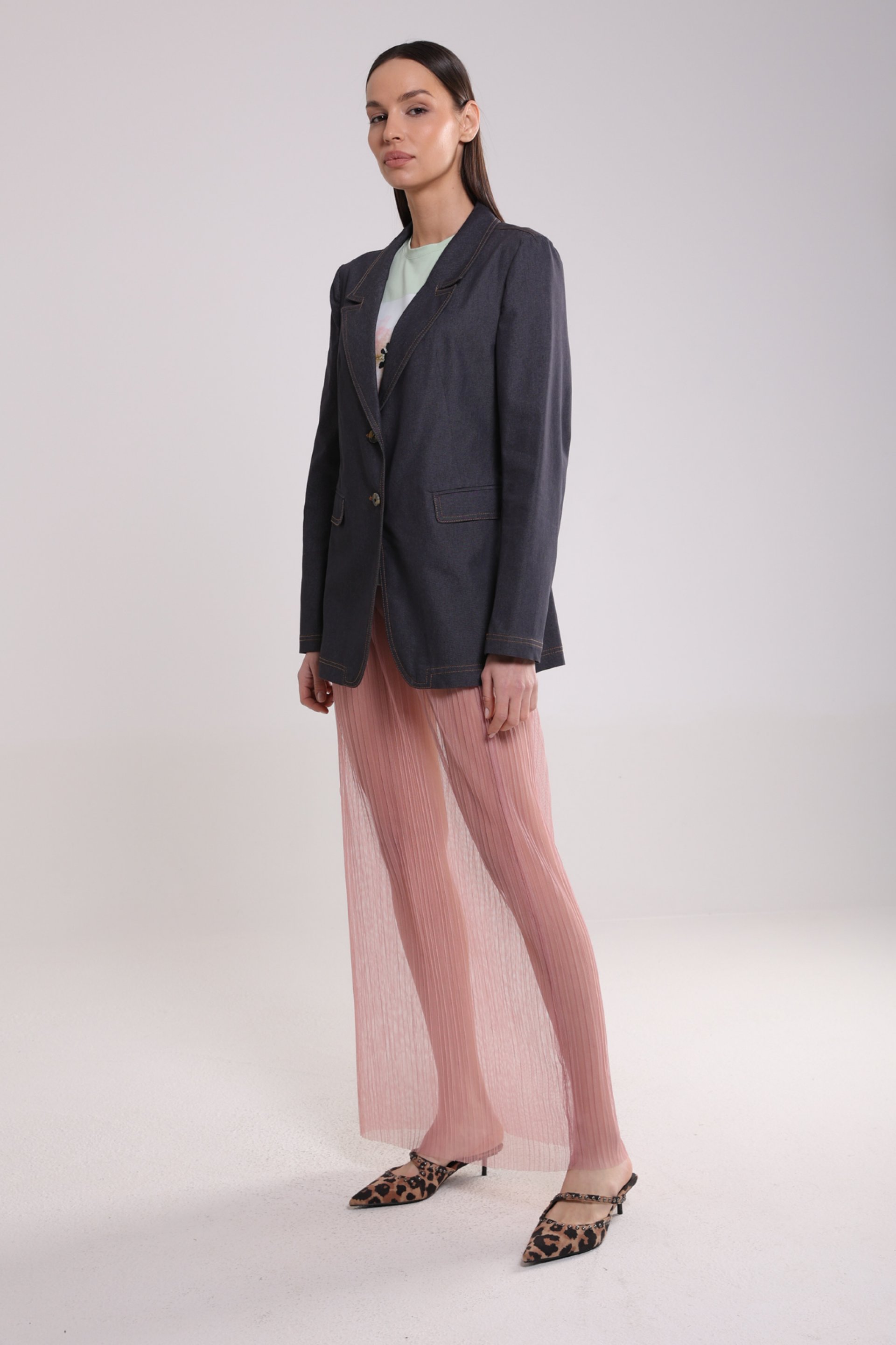 Romantična i moderna u isto vreme, ova roze plisirana suknja donosi prozračnost i lakoću pokreta. Izrađena od laganog, transparentnog materijala, pruža sofisticiran slojevit efekat, dok elastičan pojas osigurava udobnost i prilagodljivost. Idealna za eksperimentisanje sa stilovima – nosite je uz klasičan sako za elegantan izgled ili uz opuštene komade za ležernu dozu ženstvenosti.