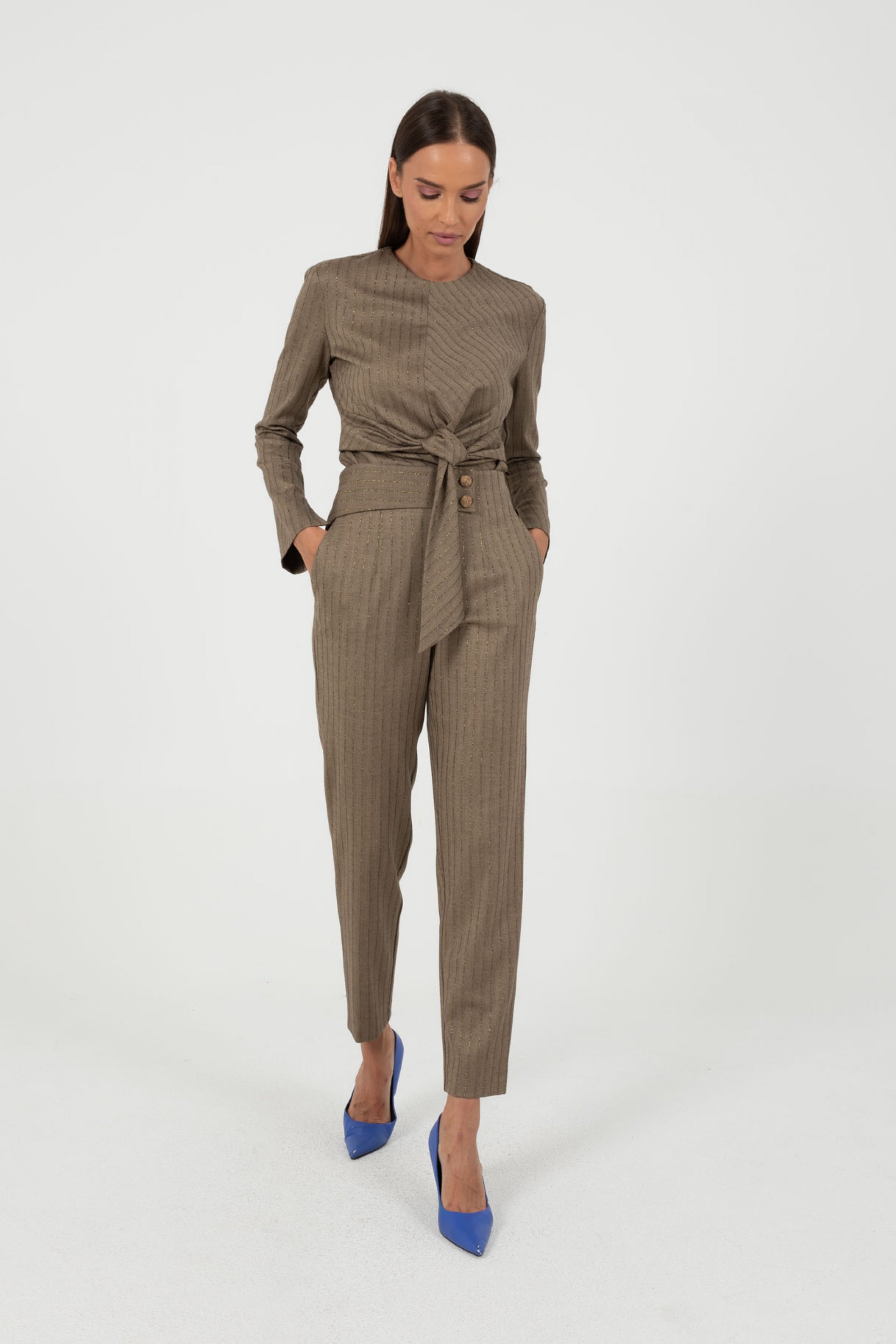 Osvežite svoj garderober sa ovim elegantnim braon pantalonama sa svetlucavim prugama. Izrađene od kvalitetnog materijala, ove pantalone pružaju udobnost i sofisticiran izgled tokom celog dana. Njihov kroj sa uskim nogavicama i visokim strukom savršeno naglašava figuru, dok svetlucave vertikalne pruge dodaju vizuelnu dimenziju i produžuju siluetu.Pantalone su opremljene sa dva bočna džepa, pružajući funkcionalnost bez kompromisa na stilu. Imitacija pojasa sa dekorativnim dugmadima predstavljaju elegantan detalj koji doprinosi ukupnom izgledu. Kopčaju se sa skrivenim rajsferšlusom na boku. Idealne su za poslovne prilike, ali i za svečane događaje kada želite da ostavite utisak. Za besprekoran i moderan izgled predlažemo ih u kombinaciji sa bluzom u komplementarnom dezenu koju možete pogledati <a href="https://www.psfashion.com/rs/sr/artikal/bluza-dugih-rukava-25570107/">ovde</a>.