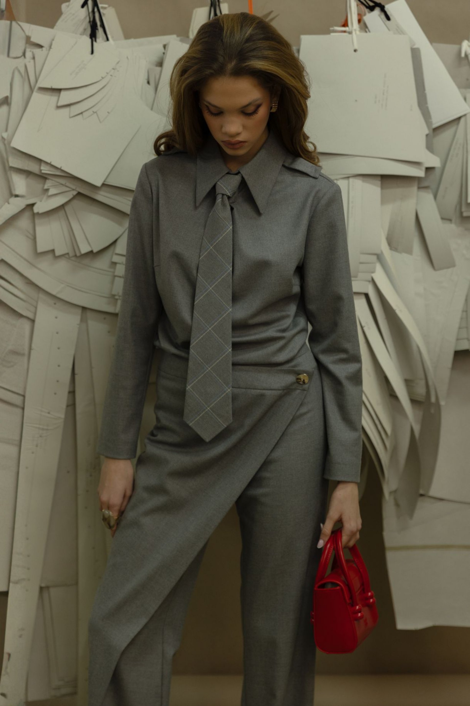 Siva bluza sa klasičnom kragnom i oštrim linijama ramena donosi elegantan spoj klasičnog i modernog dizajna. Dizajnirana od tkanine visokog kvaliteta, savršena je za poslovne prilike. Prepoznatljiv detalj sa epoletama i diskretan rajsferšlus na leđima naglašavaju njenu sofisticiranost i besprekoran kroj. Kravata nije deo bluze. Pantalone sa fotografije možete pogledati <a href="https://www.psfashion.com/rs/sr/artikal/pantalone-na-preklop-33770103/">ovde</a> .