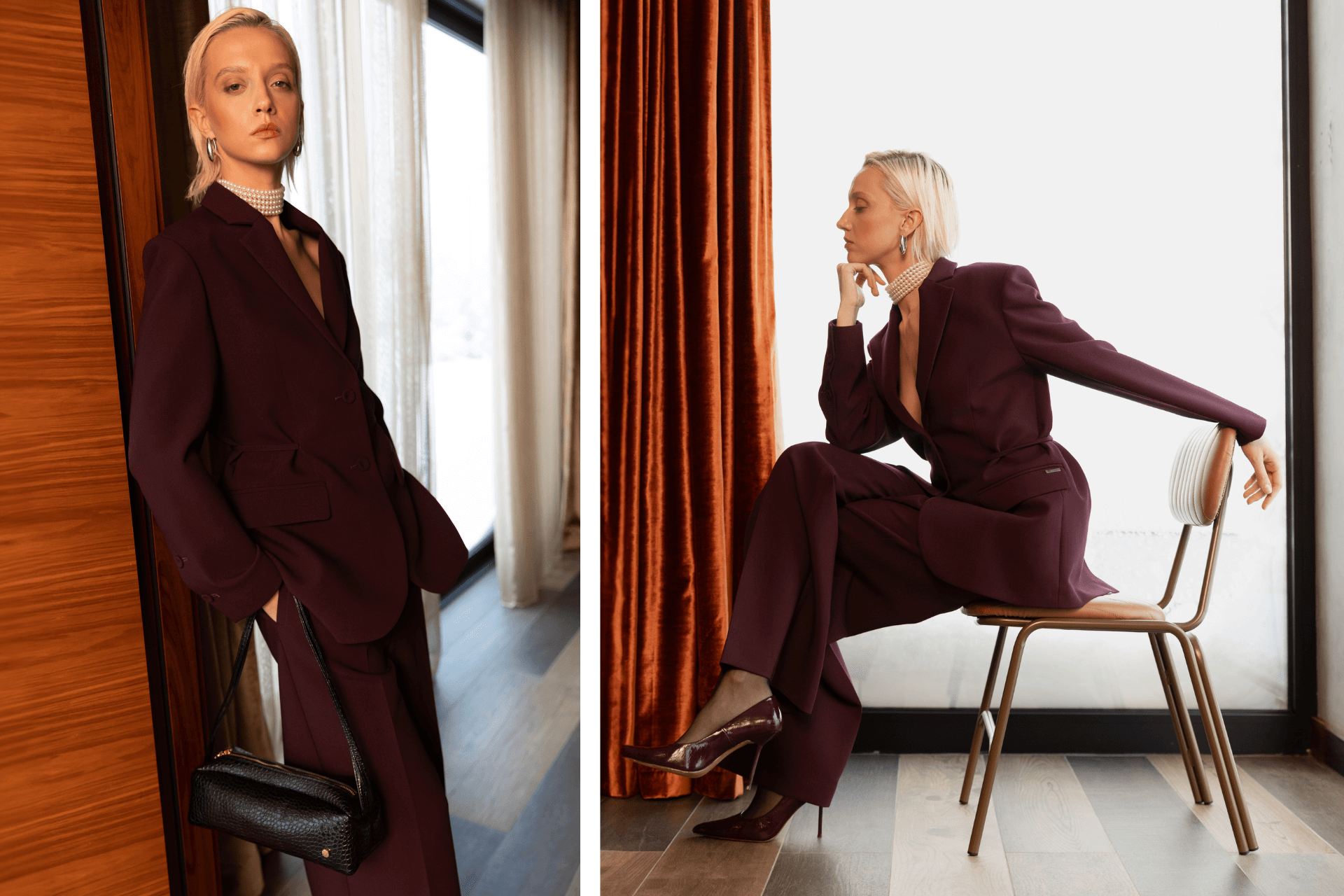 Blejzer, pantalone, torba, cipele, ogrlica, minđuše