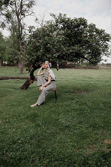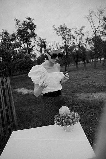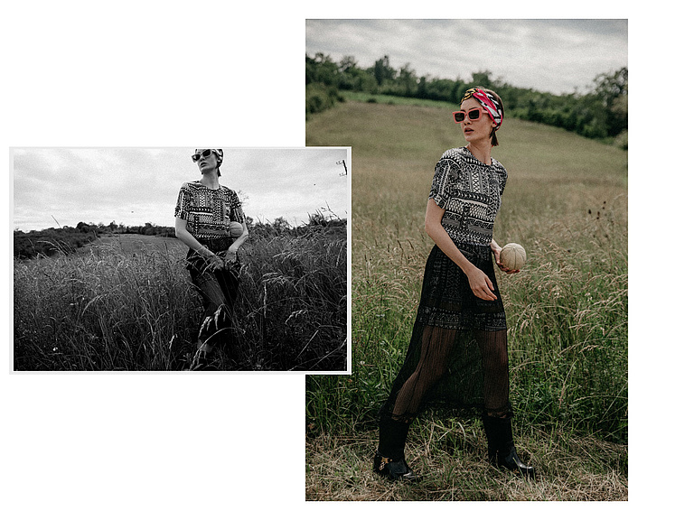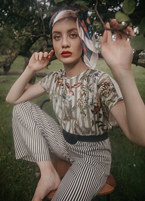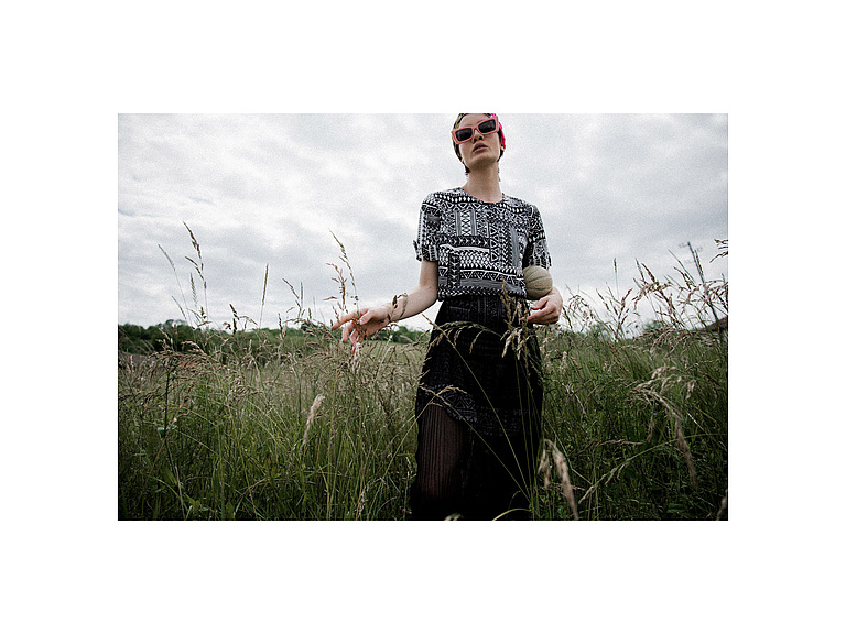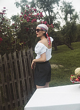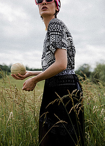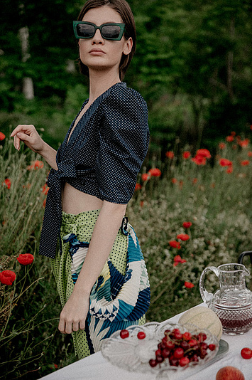 P....S....fashion bluza, suknja, naočare i ešarpa.