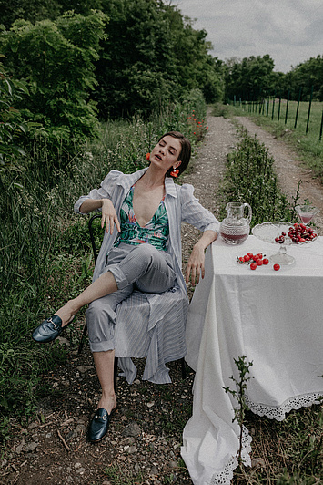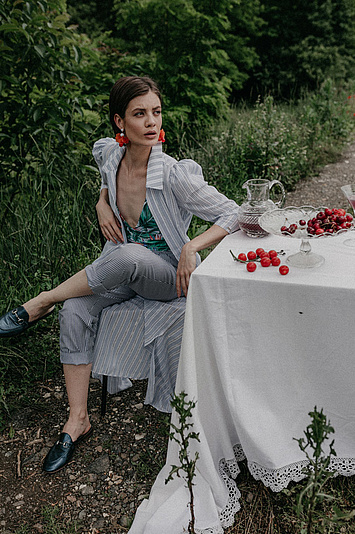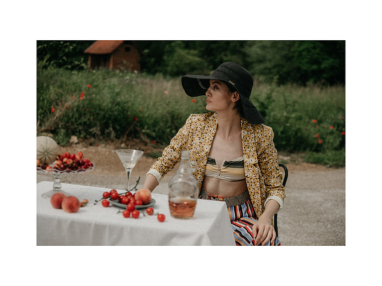 P....S....fashion blejzer, pantalone, bikini, kaiš i šešir.